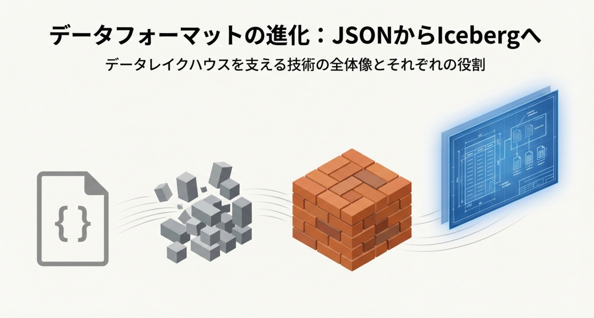 JSON、Avro、Parquet、そしてApache Icebergの違いを徹底解説。S3のスキャン量を99%削減しコストを劇的に抑えるParquetの効率性や、ACIDトランザクション・タイムトラベルを実現しデータレイクを「沼」から救うIcebergの最新機能を比較。データ基盤を進化させる最適な選択肢がわかります。