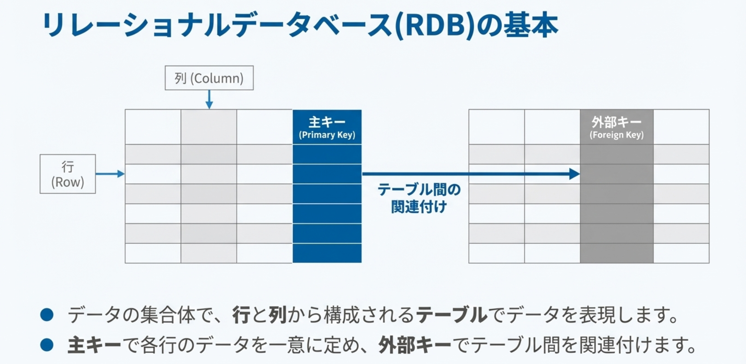 リレーショナルデータベース(RDB)は、データをから構成されるテーブルで表現するデータの集合体です。RDBは複数のテーブルで構成され、テーブルの各行のデータは主キー (primary key)という識別子を使って一意に定められます。また、外部キー (foreign key)を使用することで、テーブル間の関連付けが行われます。RDBの構築や問い合わせには、SQLという言語が使用されます。 このリレーショナルデータベースを管理するシステムが、リレーショナルデータベース管理システム (RDBMS)です。RDBMSには、Oracle Database、IBM DB2、SQL Serverなどの商用製品や、MySQL、PostgreSQLなどのオープンソース製品が知られています。