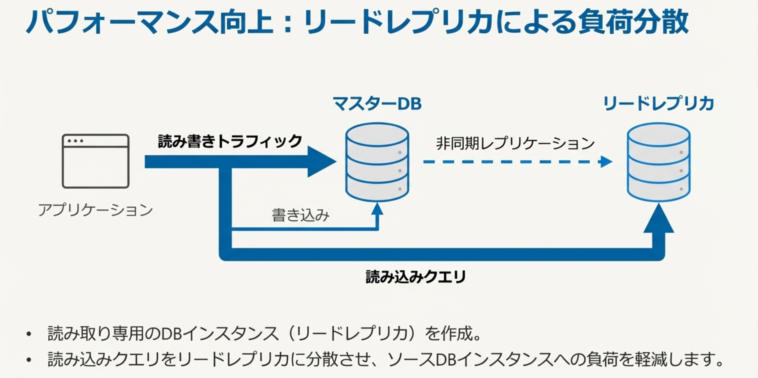 • アプリケーションからの読み込みクエリをリードレプリカにルーティングすることで、プライマリDBインスタンス(Master)への負荷を軽減し、読み取り負荷の高い処理に対してスケールアウトを行うことができます。