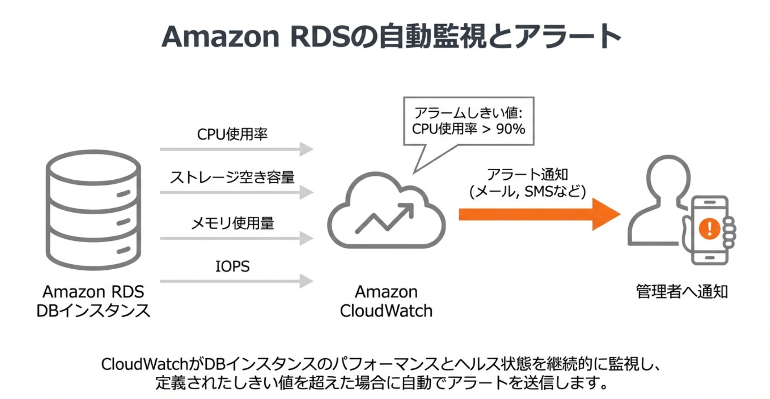 CloudWatch アラーム: 特定の期間にわたってAmazon RDSのメトリクスを監視し、設定したしきい値に基づきアクションを実行できます(例:ReplicaLagがしきい値を超えたときにSNSメッセージを送信)。