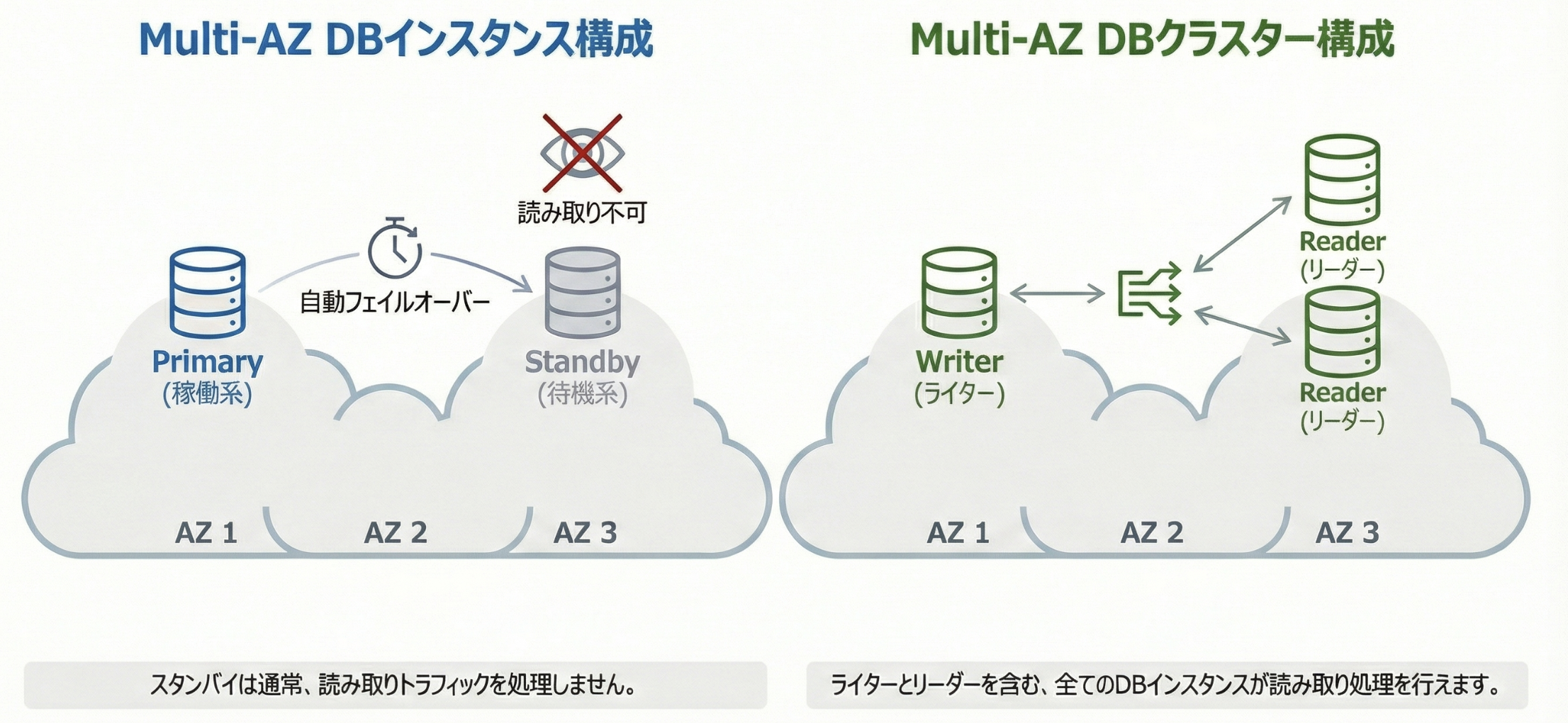 •ただし、マルチ AZ DB クラスターデプロイを選択した場合、同じAWSリージョン内の3つの別々のAZに1つのライターDBインスタンスと2つのリーダーDBインスタンスが配置され、すべてのDBインスタンスが読み取りトラフィックを処理できます。