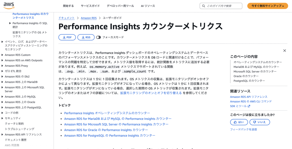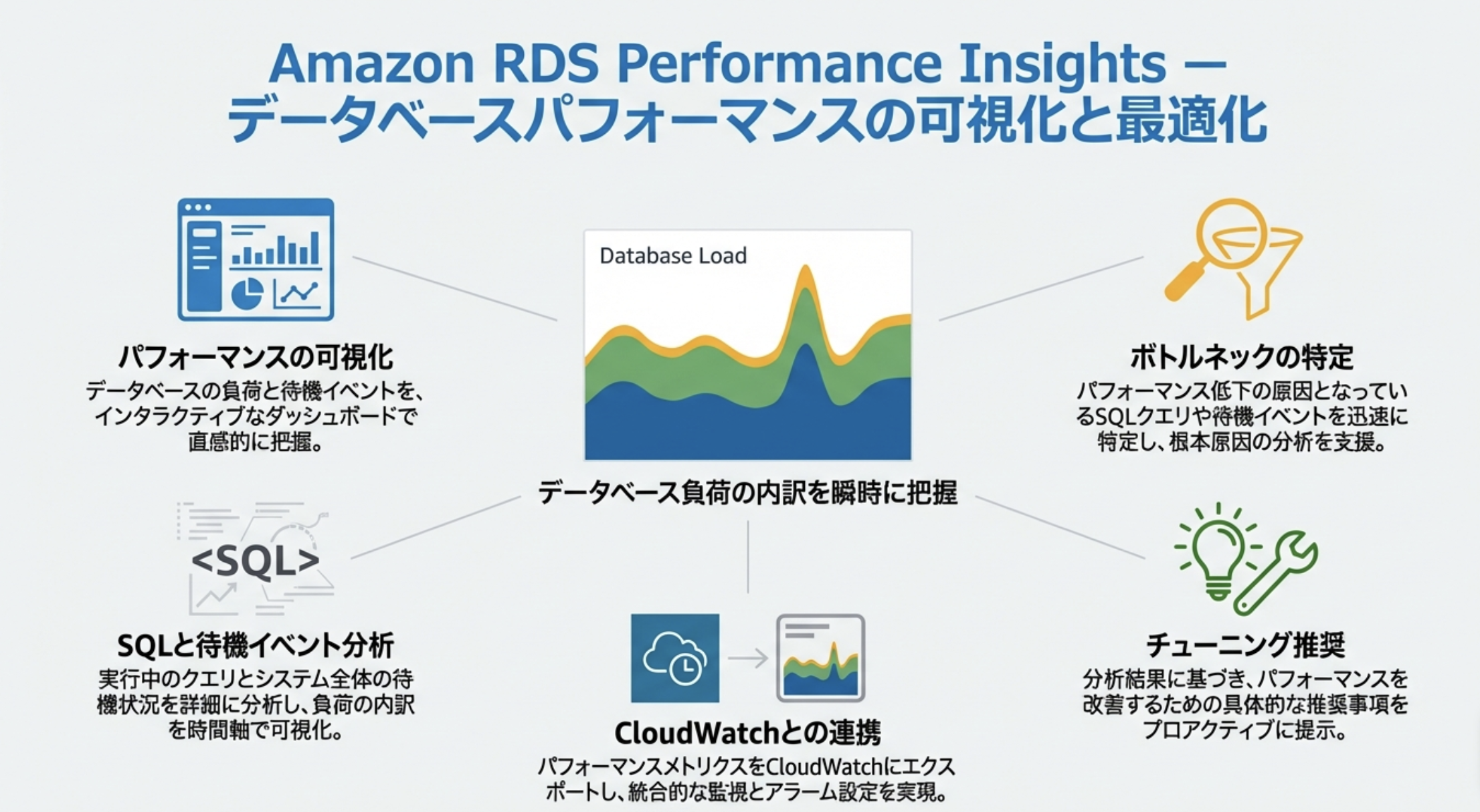 Performance Insights: データベースのパフォーマンスを明確にし、分析しやすくするための機能です。Performance Insightsダッシュボードを使用してDBインスタンスのデータベースロードを視覚化できます。