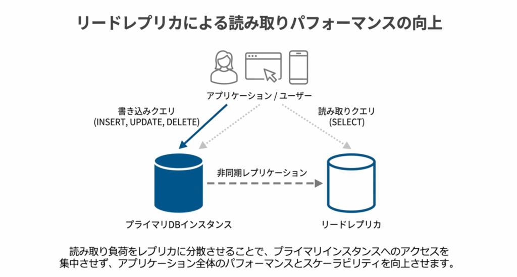 リードレプリカは、プライマリDBインスタンスの読み取り専用コピーとして機能し、アプリケーションからのクエリをルーティングすることで、プライマリインスタンスの負荷を軽減し、読み取り負荷の高いワークロードに対応するためにスケールアウトを可能にします。