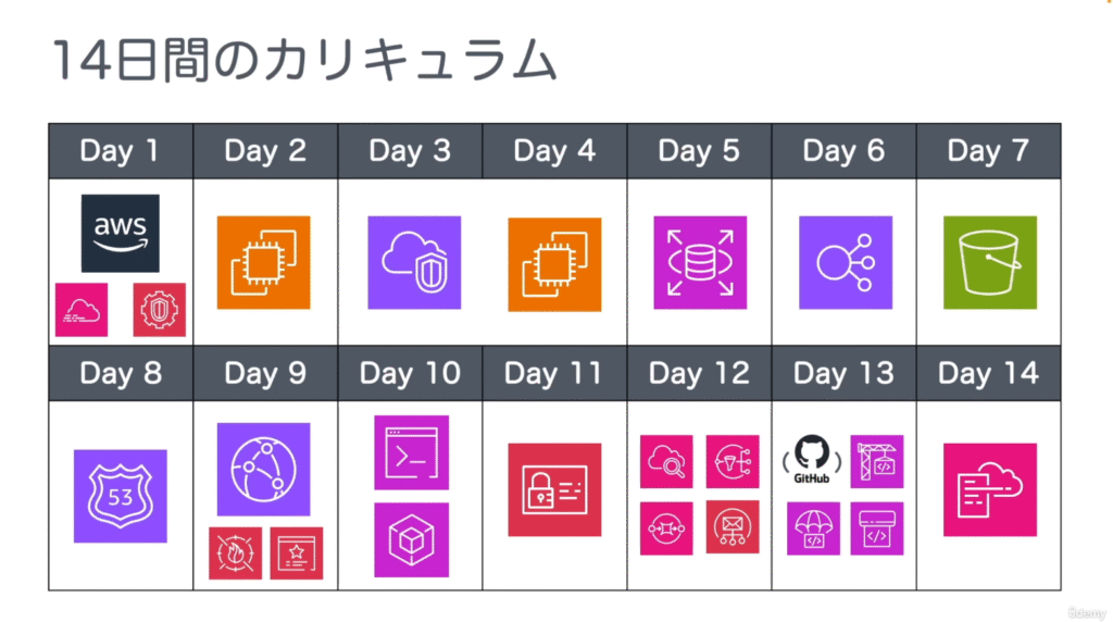| 1 | Udemy AWS 14 days受講 | 体系的知識と実践力の習得 | 初学者に最適。「手を動かしながら」22サービスを学ぶ。 |