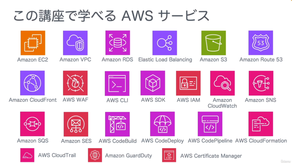 • 学習範囲: Amazon EC2、Amazon VPC、Amazon RDS、Elastic Load Balancing (ELB)、Amazon S3といったマネージドサービスから始まり、Amazon Route 53、Amazon CloudFront、AWS CloudFormation(Infrastructure as Code)、Code シリーズ(CI/CDパイプライン)など、22サービスを実際に手を動かしながら学習できます。