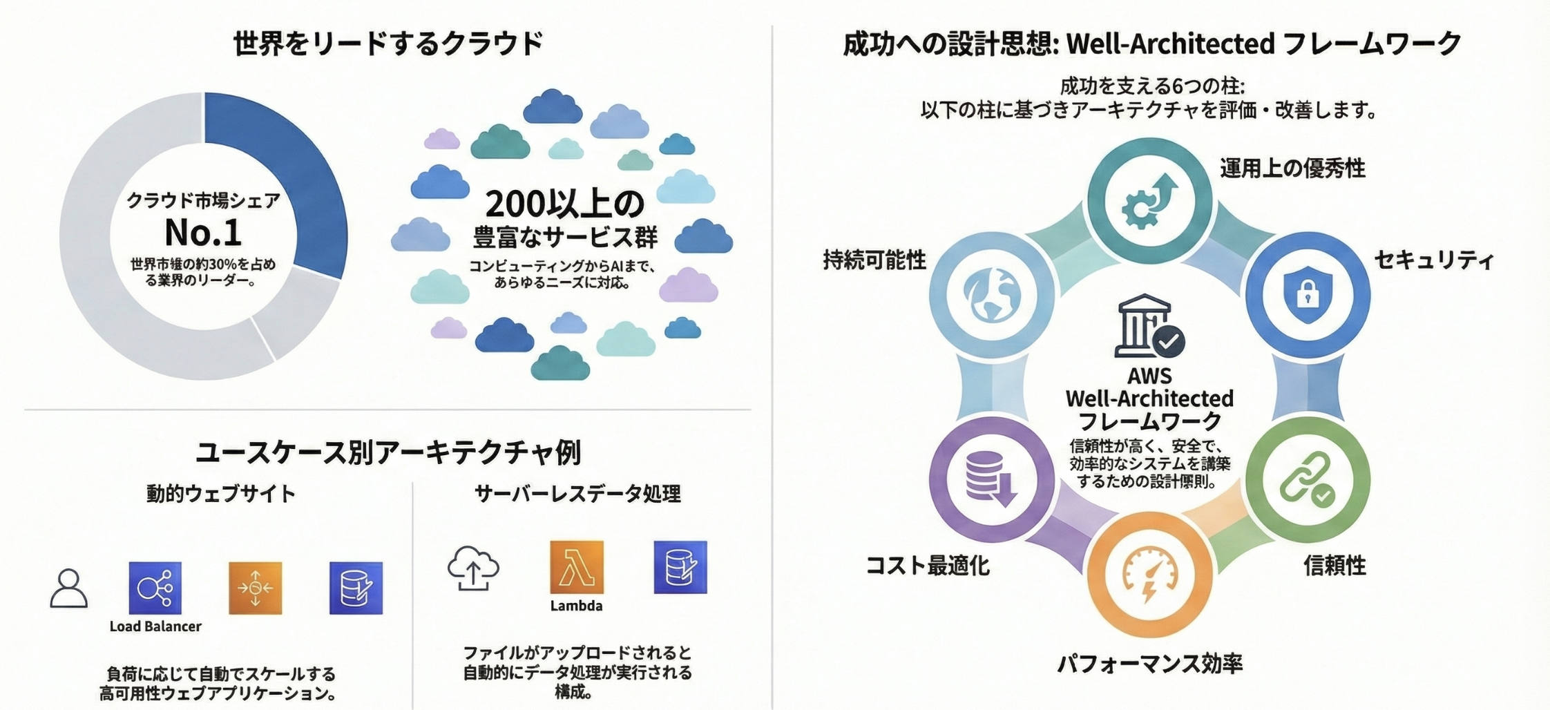 | 2 | 全体像の整理 | 設計原則とサービス連携の理解 | Well-Architected Framework(6つの柱)で設計思想を理解する。 |