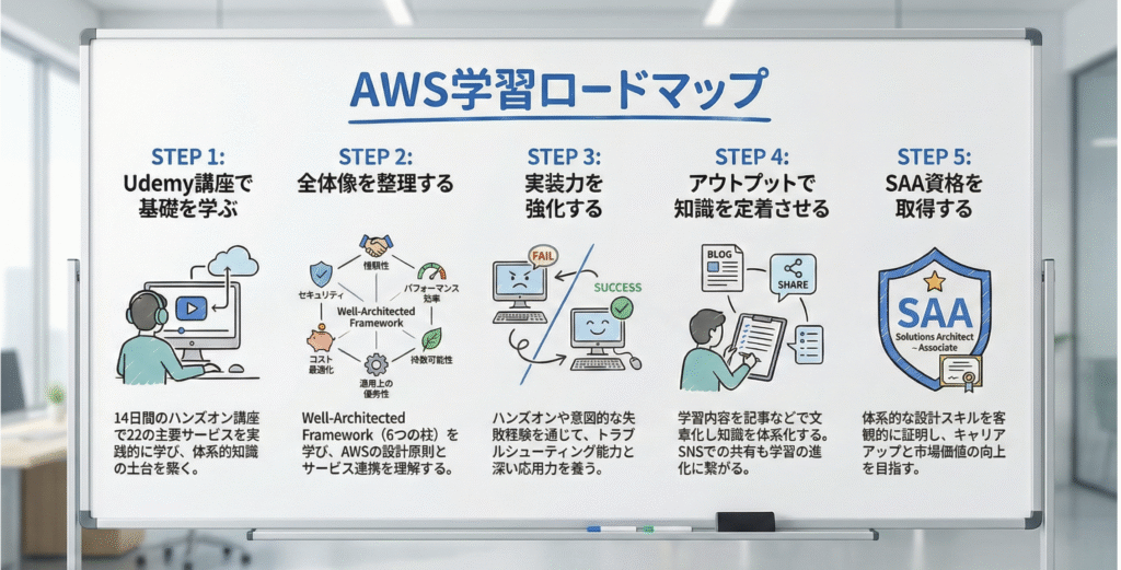 AWSの学習ロードマップは、まるで料理の修行に似ています。まず「Udemy AWS 14 days」で基本の包丁の使い方や火加減(コアサービスのハンズオン)を体で覚えます。次に「全体像の整理」で、レシピ(Well-Architected Framework)を理解し、なぜその調理法(設計)が最良なのかを学びます。その後、「実装法の理解」で様々な食材(サービス)の扱いに習熟し、「アウトプット」で学んだことを自分の言葉で他者に伝える(料理を振る舞う)ことで、知識が本物のスキルとして定着します。そして最後に「SAA資格取得」は、プロの料理人としてのライセンス(設計能力の証明)を得ることに相当し、これによりキャリアパスが大きく開かれます。